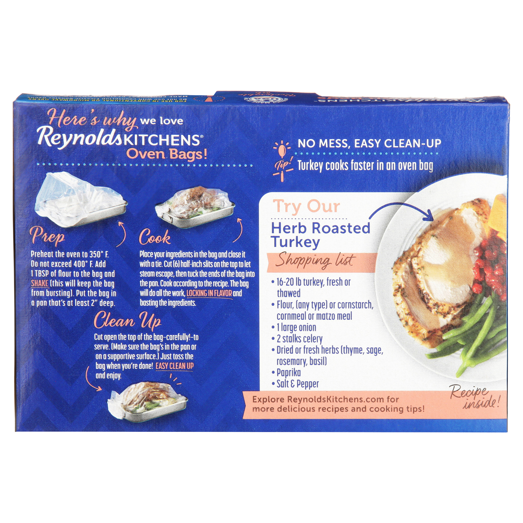 • learn some tips to create a more flavorful and juicy roast turkey when using an oven roasting bag to cook a turkey. No mess, easy clean up. Here's why we love reynolds kitchens oven bags! From the reynolds kitchens, the taste of tender, juicy turkey, quick roasted in your oven. 19 in x 23.5 in (482 mm x 596 mm).